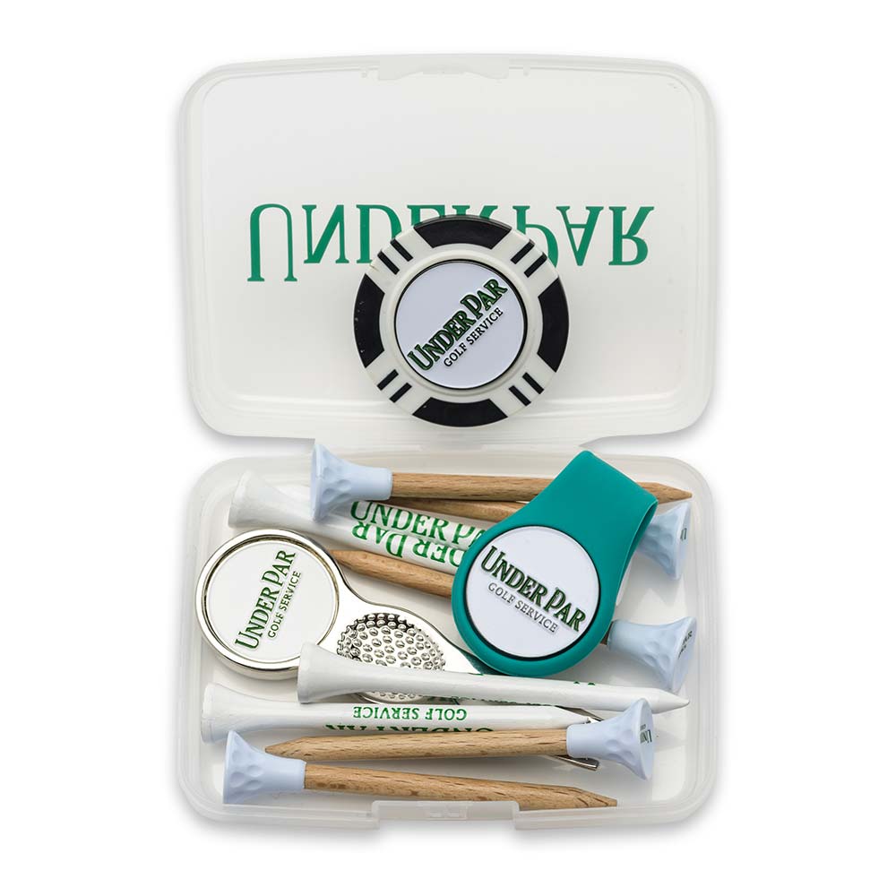 Beispiel: Box, 10 Tees, 1 Pitchgabel, 1 Hatclip und 1 Pokerchip: